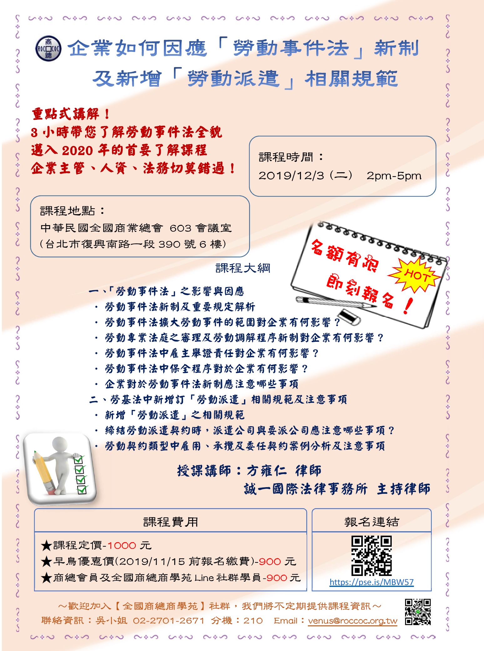 本次課程採重點式講解,於3小時帶您了解勞動事件法全貌,為企業人資、法務、經營管理者邁入109年的首要必修課程之一。