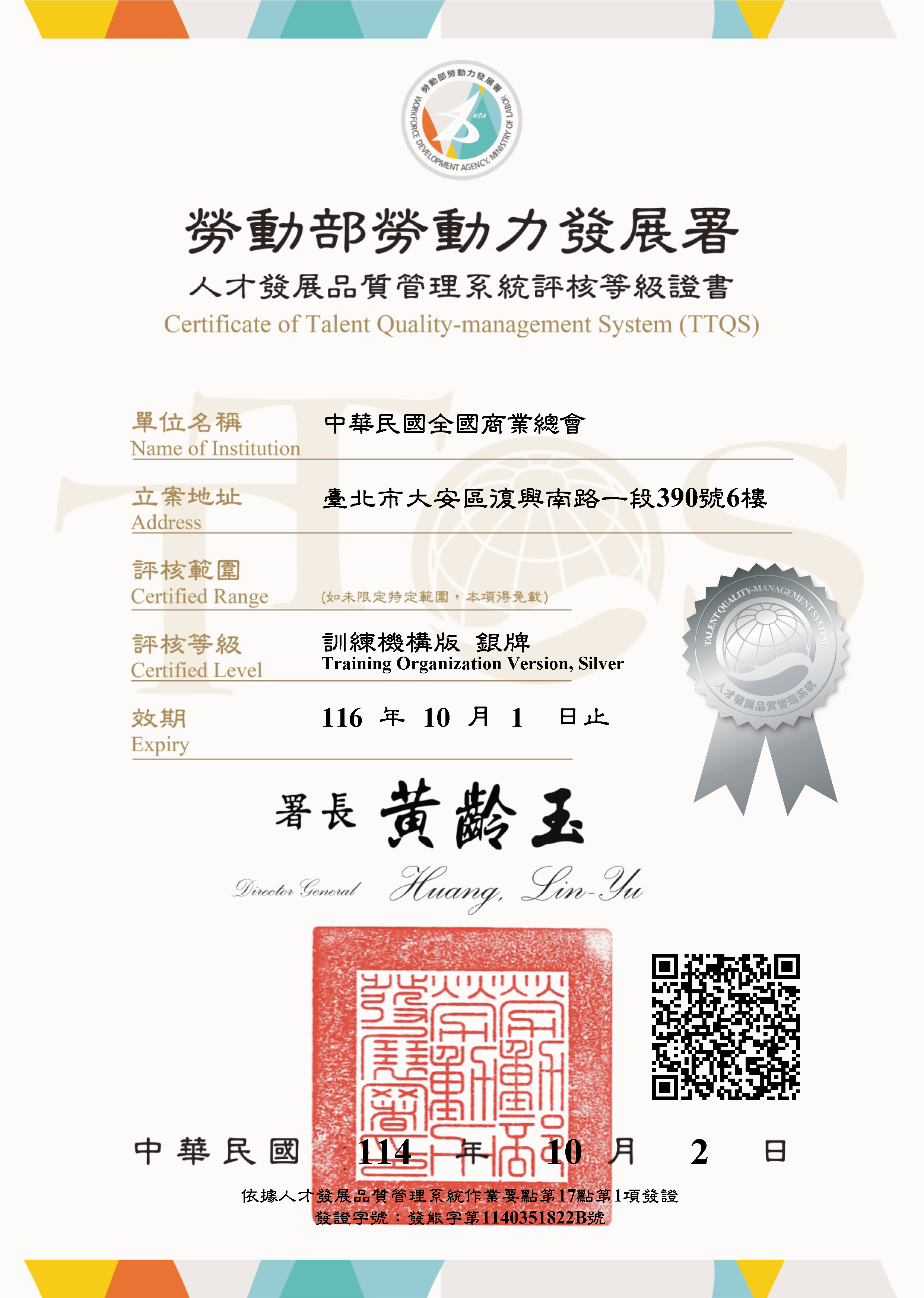 中華民國全國商業總會自民國99年起持續參與TTQS人才發展品質管理系統評鑑,114年評核等級 (訓練機構版 銀牌) 為國家訓練品質認證之優質訓練單位。