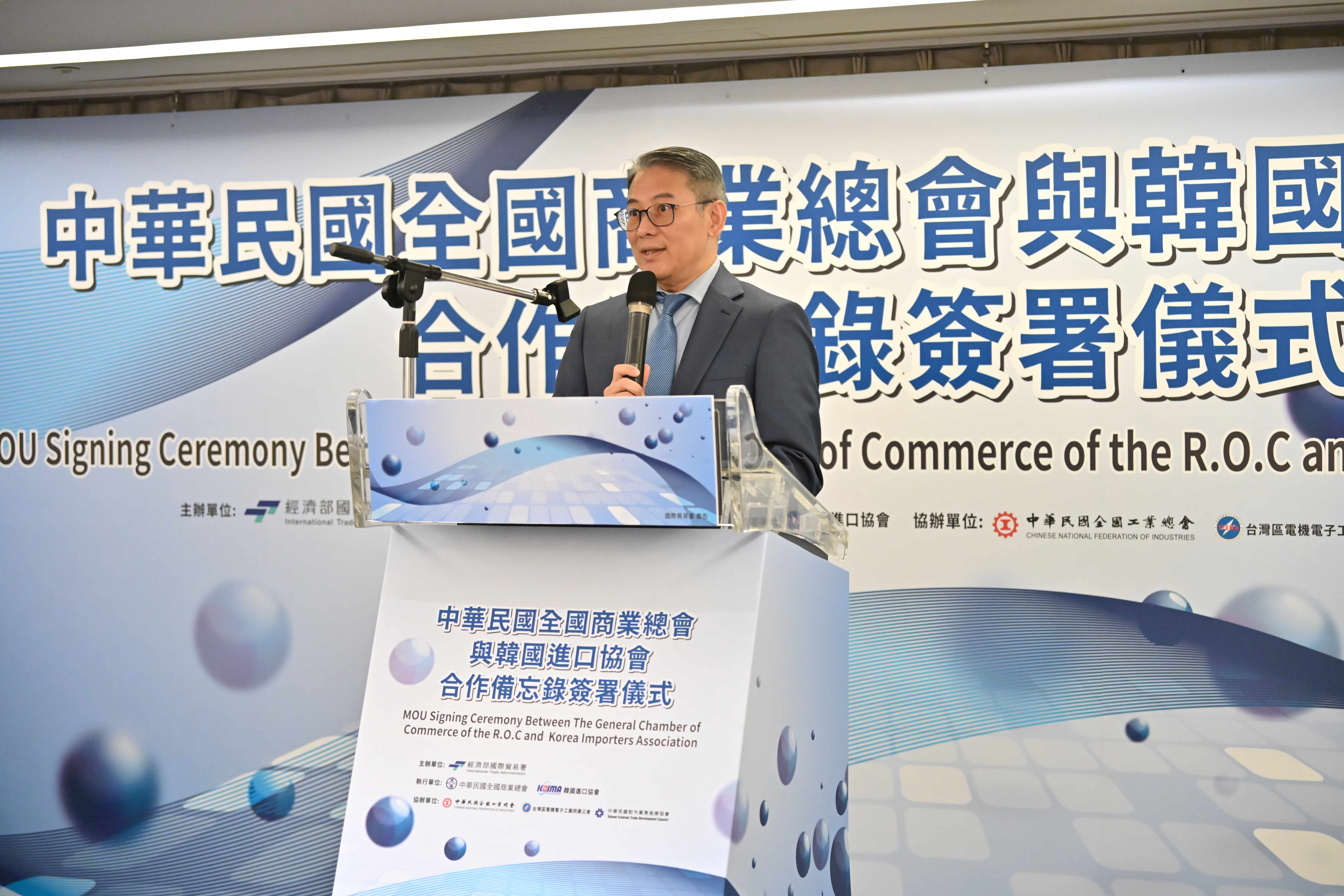 經濟部國際貿易署劉威廉署長很榮幸見證全國商業總會及韓國進口協會簽署合作備忘錄,相信藉由兩會互訪及MOU的簽署,台韓商界能有更制度化的交流。劉威廉署長表示,今年已編列預算,希望鼓勵台灣的會展旅遊;在鼓勵進口方面,未來規劃方向是讓有意願且實實與國外有商業合作關係的企業主,可向國際貿易署申請邀請買主到台灣採購。台灣與韓國已簽署避免所得稅雙重課稅協定,未來希望在制度化基礎上,深化彼此在觀光、經貿、人員交流的合作關係。