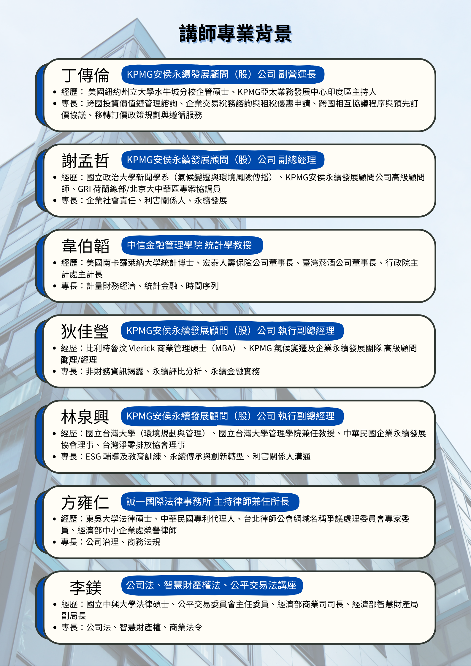 二、課程邀請具豐富產業與實務經驗之專業師資授課,內容涵蓋董事決策實務、企業永續策略、法規遵循要求及經營管理技巧等主題,協助學員掌握最新政策與治理趨勢,提升判斷力與企業管理效能。