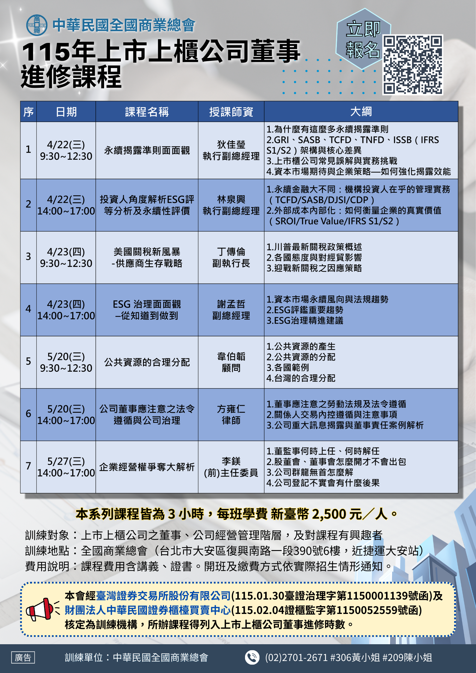 一、本會規劃辦理「115年上市上櫃公司董事進修課程」,旨在協助上市上櫃公司董事及公司治理相關人員持續精進專業能力,強化在企業治理、法規適用與經營判斷等面向的實務操作,課程設計採系統化方式,兼顧理論與實務。